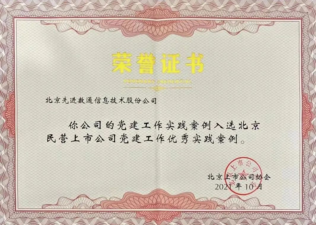 近期,北京上市公司协会授予北京k8凯发信息技术股份公司荣誉证书,k8凯发党建工作实践入选北京民营上市公司党建工作优秀实践案例,相关党建活动已收录在《北京民营上市公司党建工作优秀实践案例汇编》。